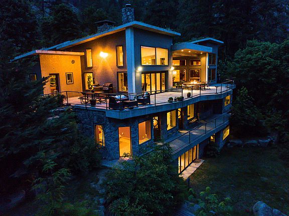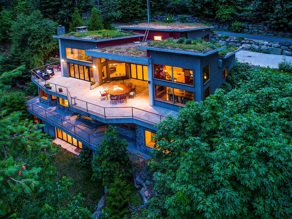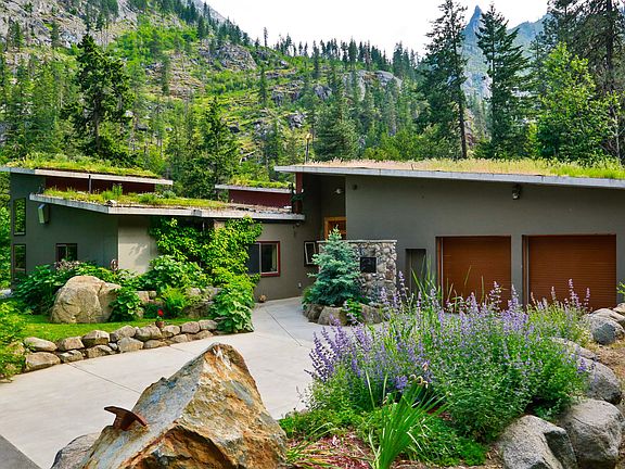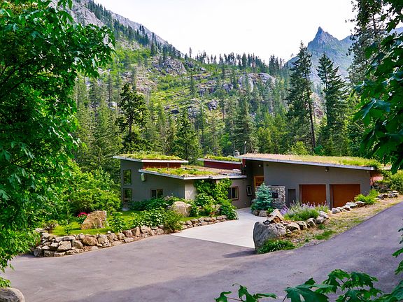 Icicle River Earth Home: Frank Lloyd Wright inspired, designed by renowned PNW architect David Waldron. Three, cohesive; south-facing levels, stair-stepped and constructed with massive concrete insulated forms. 6800+ sq ft, 5 bedrooms, 7 baths, serviced by elevator or custom concrete stair. Open concept lives seamlessly between the in and out doors. Floor-to-ceiling entry waterfall, radiant heat and cooled concrete floors inlaid with brass fish designed by the very artist showcased at SeaTac Airport. NanaWall doors,dry-stack, spilled-rock Rumford style fireplace; 3-zoned gourmet kitchen, media room, sauna and wine cellar. Watch the sun rise over Mountain Home Ridge, set over the Enchantments. Unequalled river and canyon views. Life on the Icicle River...undeniably magical.