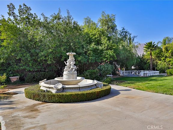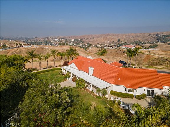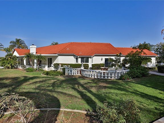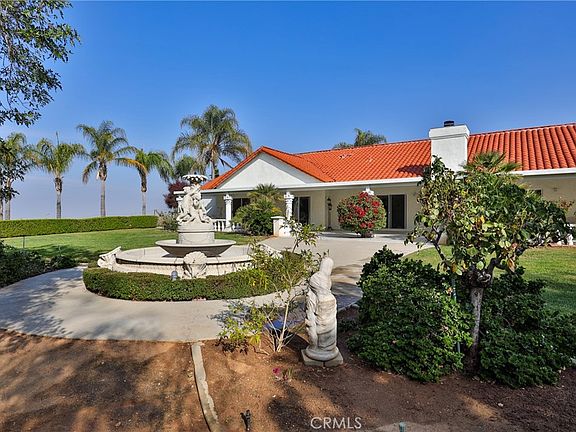 Beautifully situated and wonderfully spacious 4 bed, 4 bath Reche Canyon custom built home with expansive mountain views and serene park like grounds. Double doors open to the privacy of the master suite which has a large retreat with fireplace, a walk in closet, and an oversized bathroom with dual pedestal sinks, a large tub and separate shower. All of the rooms at the rear of the home look onto the lovely rear yard including the light filled spacious kitchen with granite counters and large island, also there is a large eat in area and kitchen adjacent is a formal dining room. The formal living room with fireplace has a wet bar and plenty of room to entertain. The interior front entrance of the home is flanked by open plan spaces with beautiful marble floors and arched entries. The extra bedrooms, as with all the rooms in the home are generously proportioned, there is a second bedroom with a ensuite bathroom and one room with a murphy bed.
