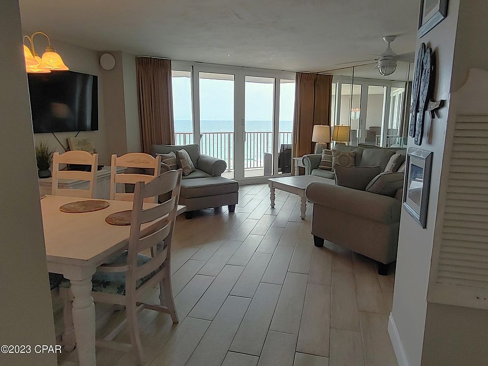 Dunes of Panama E903 - Absolutely stunning gulf front Deluxe 2 bedroom, 2 bath condo. Beautifully remodeled and updated in 2022 and would make a perfect vacation rental or second home. Ceramic tiled wood grain floors throughout, textured ceilings, stainless steel appliances, tiled master shower, blackout curtains. This gorgeous condo is a must see! The Dunes of Panama Resort has 1,500 linear feet of sugar white sand, 3 gulf front pools (one heated), tennis courts, basketball, free Wi-Fi, fitness room, volleyball, shuffleboard, outdoor BBQ grills, Stingray's Restaurant and gift shop and the Sneaky Tiki poolside.