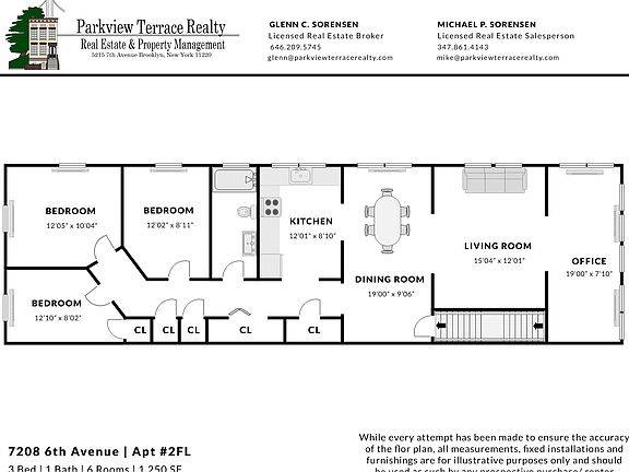 Welcome to 7208 6th Avenue in Bay Ridge! This LARGE three bedroom + office boasts 6 large rooms offering a comfortable setup with a large living room area, tasteful kitchen, and eat-in dining room. The apartment has a separate entrance to the 2nd floor of a private two family house. Each of the bedrooms is generously sized, making this home ideal for anyone in search of comfort and space. The kitchen features ample modern cabinetry, and sleek countertops, perfect for both everyday cooking and entertaining guests. The bathroom has updated floor tiles, a large vanity, and a deep soaking bathtub with a glass enclosure. Apartment Features: -3-bedroom apartment with generous closet space (refer to floor plan marked as 'CL' for closets) -Spacious living room and hardwood floors throughout the unit - Enclosed den serves well as at an home office with gleaming light from front windows -Kitchen with plentiful storage -Newly renovated bathroom with tile flooring TRANSPORTATION: Just a short 10-minute walk away, you'll find the R subway line at the Bay Ridge Avenue station, making commutes to Manhattan and beyond a breeze. Multiple bus lines are also nearby, providing easy access to the rest of Brooklyn. *Owner is willing to leave dining table & couch furnished with apartment* Send a contact request today to schedule a tour!