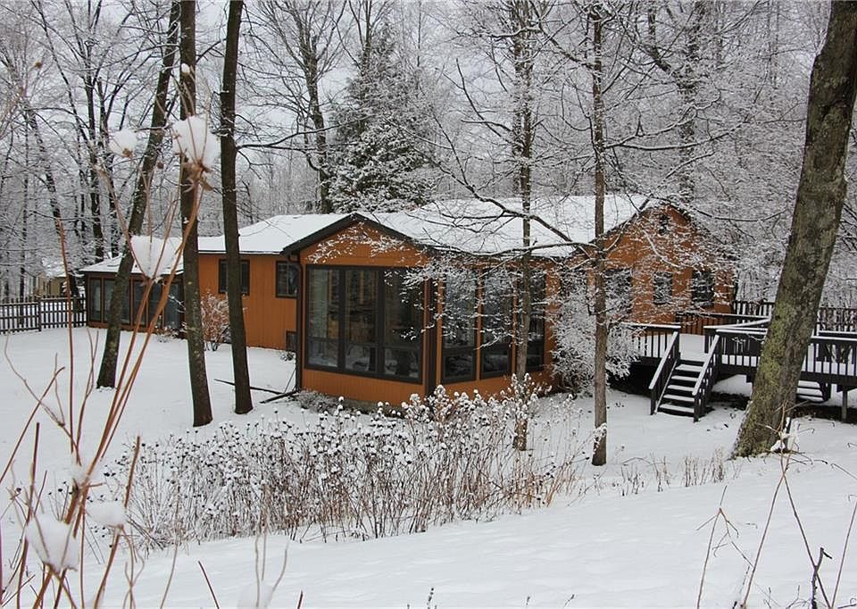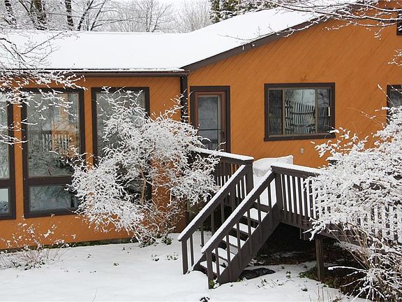 Builder's personal home in a country setting only half a mile from village center! Deeded ownership with only 2 other property owners on a lovely pond! Ranch style home with partially finished basement and attached two car garage. A mix of open and wooded land for privacy as well as use for yard/gardens/outdoor enjoyment. Scenic kitchen window over sink and tile peninsula opening up into the dining room then opening up to one living room. Second living room coming in from the attached garage with first floor laundry. Two bedrooms with full bath on one side of the house and main bedroom and bath on the other. Office next to the front door could also be a 4th bedroom! More space for storage or bonus rooms in the basement. Huge windows in the 3 season great room w/ indoor hot tub space!