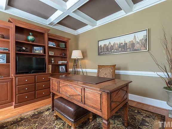 Pristine custom 3-sided brick home minutes from Umstead Park & RTP. New water heater & 1st floor HVAC. Corner lot with private backyard. Gleaming Hdwds, moldings, wanes coating, plantation shutters, coffered & trey ceilings. Gourmet kit w/granite, SS appl's, island bar, walk-in pantry & spacious bkfst area w/access to screened porch & deck. Elegant dining rm & study. Relaxing master suite w/separate his/hers large walk-in closets. Large bonus room w/back staircase. Walk-up attic for future expansion.
