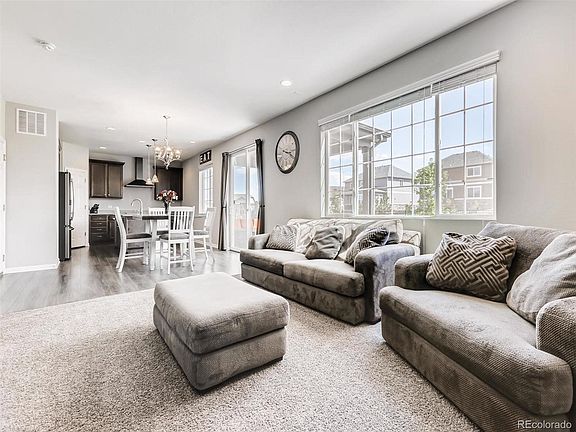 This nearly brand new, contemporary single family residence in Serenity Ridge "wows". Built by Richmond American Homes, this two-story contemporary residence is loaded with upgrades throughout, including an upgraded elevation featuring wood and ledger stone exterior with generously sized, covered front porch and back patio. You'll love the open layout of the home on the main level with cooking, dining and entertaining complimented by 3 bedrooms and a loft upstairs for privacy and seclusion. Additionally, the unfinished basement provides a blank canvas for you to finish or use for storage! The contemporary design includes a kitchen highlighted by an oversized slab granite island with pendant lights overhead and appointed with undermount sink, satin nickel fixtures and hardware, and 42" cabinets capped with crown molding. The "perfectly-sized" backyard enjoys flat topography for maximum enjoyment and backs to a walking path that meanders and connects the Serenity Ridge neighborhood. Residence has solar roof panels that buyer will need to qualify for to assume. Award-winning, Blue Ribbon Cherry Creek Schools! Southlands Mall and quick access to E-470 nearby!!