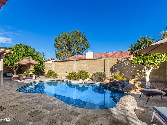 Single Level, 4 bed, 2 bath home & no HOA. Enter home to open front room & dining room w/ high ceilings, tile flooring &plantation shutters. Kitchen features SS appliances, pantry, plenty of wood cabinets, & large wraparound counter breakfast bar that opens into family room. Enter your backyard oasis updated with Travertine decking and patio, outside counter bar with kitchen pass through window, sparkling pool with water feature! Landscape offers mature orange, grapefruit &lemon trees.Split floorplan feature master with walk in closet, 2 sink vanity, separate toilet room w/ storage and shower. This home is located conveniently near restaurants, schools and shopping spots.