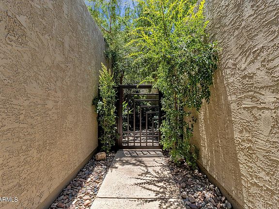 Escape to this remarkable all suite, 3 bedroom, 3.5 bath oasis located in the heart of Scottsdale, in gated Las Villas. Renowned Architect, Bennie Gonzales, created unique, liveable floor plans featuring soaring ceilings & windows, multiple lush patios & spacious living areas while maintaining privacy & ample storage. Boasting modern upgrades including stunning custom iron doors & gates, black marble floors, recessed lighting, updated Kohler bathrooms and kitchen and fresh paint, this home makes a sophisticated statement.