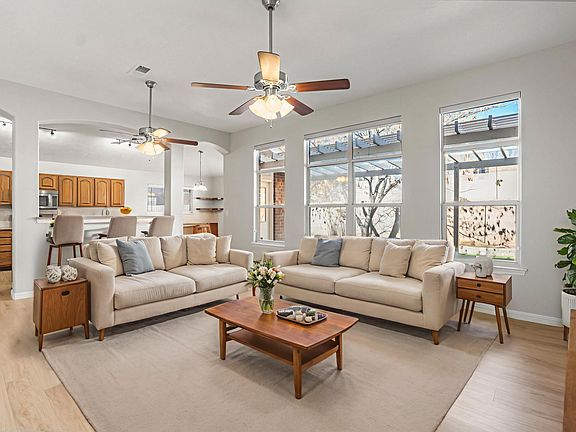 Beautifully updated 3-bedroom, 2-bath home with a 3-car garage! This move-in ready property features fresh interior paint and new flooring throughout, including new LVP in the main living areas and primary bedroom and new carpet in the secondary bedrooms. The light-filled primary suite offers a walk-in closet with custom organization system and a private bath with dual sinks, garden tub, and separate shower. The kitchen includes stainless steel appliances, and all appliances convey, including refrigerator, gas range/oven, and microwave. Enjoy refrigerated air for year-round comfort. The low-maintenance front yard boasts xeriscape landscaping, while the fully landscaped backyard offers a sprinkler system, storage shed, and covered patio pergola--perfect for outdoor living.