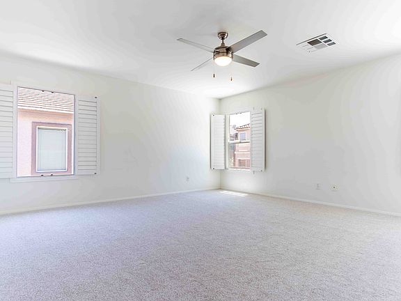 NO PETS. Application online on amaximaRealty. Stunning home conveniently located near Red Rock Casino, top dining, shopping, and highly rated schools. This well-maintained, spacious 2,314 sq ft two-story features 3 bedrooms, a loft, and 2.5 elegant baths, with all bedrooms and the loft located upstairs. The open floor plan greets you with abundant natural light, while the living/dining area flows seamlessly to the rear patio with a stylish aluminum cover. The modern kitchen features granite counters, stainless appliances, abundant cabinetry, and a spacious pantry. The master suite boasts a jetted tub, dual sinks, a walk-in shower, and a generous walk-in closet. The expansive loft is perfect for an office or playroom. Updates include two AC units installed in March 2022, stylish Sunburst shutters, granite counters in bathrooms, new sinks and faucets, brand new plush carpet, and a security system ready for activation. The backyard features enticing landscaping, ideal for relaxation or entertaining. Don't miss this great home!