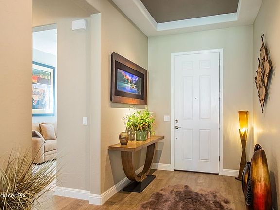 Simply Elegant, Designed to Perfection and Ready to Move Into! This expanded Pursuit model offers a resort style experience in a serene setting of privacy, nestled in Oxen Ridge. Designer touches galore, 10' ceilings, 8' doors, custom window treatments bring the rooms to life, the versatile and timeless use of Heather Grey easy to maintain floors in high traffic areas, and luxurious fitted cabinetry in the kitchen and baths, expansive center island is made to impress the chef in you. Top of the line, full appliance package, includes double ovens, French door refrigerator and front loading Washer & Dryer. Entertaining could not be easier with the addition of the Sun Room right off of the dining area, and solutions abound when you step out to the patio and experience the expanded paver covered patio with privacy area and spa, just made for those days after golf or a hard work out. Enjoy the evening view and privacy of the location next to the park. Your home is a reflection of you...and this just might say it all! This home is located in Sun City, an age restricted community, with all of the amenities within easy access, golf, walking trails, community center, and more!