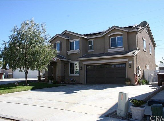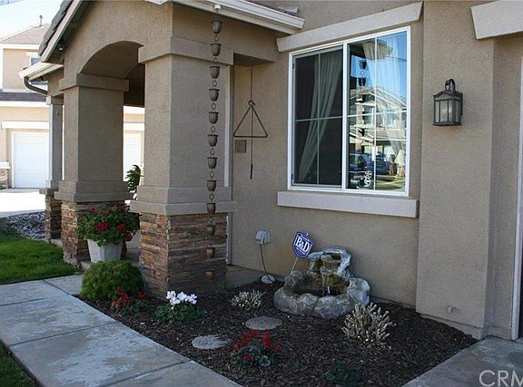 Beautiful newer pool home loaded with upgrades and NO mello-roos (NO special assessments on taxes) and NO hoa fees. The center island kitchen has granite counter-tops w/ full height back splash, upgraded maple cabinets, deep granite sink, walk in pantry, hidden trash can and beautiful mountain views from the windows and clear glass back door. Open concept great room with family room and eating area adjacent to the kitchen. Formal living room, formal dining room, great room and a separate loft make this home very spacious. Gorgeous wood laminate flooring entire downstairs and on the staircase, 6 interior switched ceiling fans, whole house fan, water softener system, home alarm system, utility sink in laundry room and wireless thermostat are a few of the upgraded features. The back yard has a custom pebble tech spool (swimming pool/spa combo) with a waterfall/grotto/color changing light all remote controlled on a saltwater system, gas fire pit, stained custom stamped concrete, alumawood patio cover with two ceiling fans, low maintenance drought tolerant landscaping & two storage sheds. Small RV/boat parking on the extra wide front concrete driveway. Wrought iron gate. Solar panels leased @ 15 cents per kilowatt (that's lower than Edison's first tier rate).