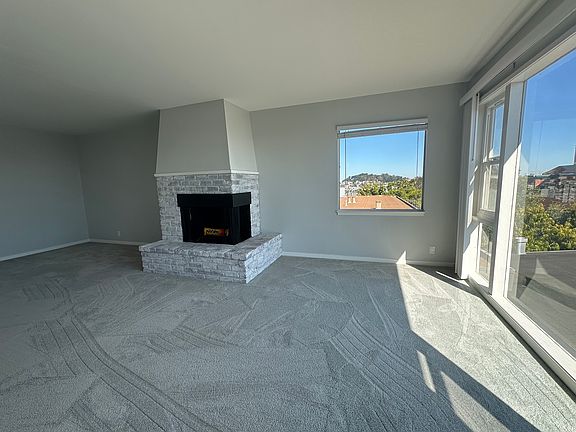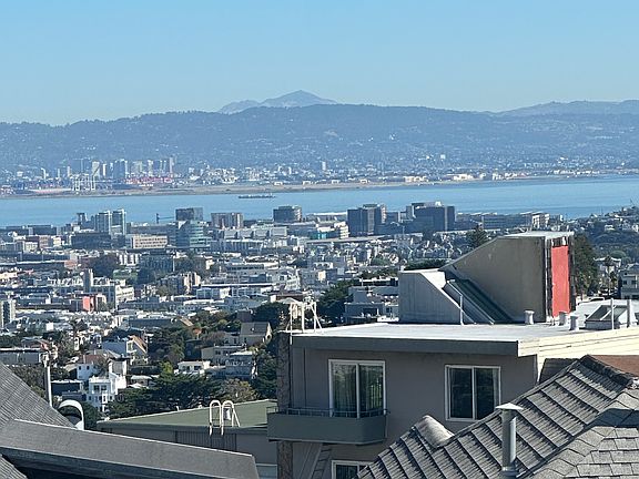 This 1br, 1ba apartment is located on Corbett Ave (x-Romain). It is down a private drive which keeps it away from street noise. The unit faces the east and has sunrise views from the top floor of this 2 story building. The entry opens directly towards the living room with a large window that goes from the floor to almost the ceiling. The view is of the East Bay and south as well and thru the left side window you can see the Marin Headlands and Mt. Tam.