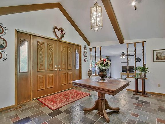 Don't miss this sprawling ranch home located on Fox Ridge Golf Course with over 2800 square feet. This classic home was designed with views in mind - beautiful windows in all the rooms let in wonderful natural light overlooking the golf course out back and wooded creek area out front. This one is a stunner as you walk in to the large foyer, connecting the formal living room, formal dining and grand living room. Both formal living and formal dining have gorgeous bayed windows looking out to the trees out front. In the casual living room, you'll love the vaulted ceilings with wood beams, wet bar and brick woodburning/gas starter fireplace with built-in shelves on both sides. The kitchen has been recently updated with quartz countertops, plus it features cabinets with pull-out drawers, double oven, deep pantry, and window over the sink so you can look out the backyard. There is a breakfast nook attached to the kitchen, perfect for casual dining. Next to the kitchen, you'll find a nice mud room with laundry, coat closet and deep utility sink. There is a door to the backyard from the laundry area for easy clean up after working in the yard. The 3 car side load garage features storage cabinets plus attic storage room with pull-down stairs. The 3rd bedroom and 3rd full bathroom are located on this side of the home, great for guests or teenagers. Lovely walnut floors run down the hallway from this end of the house to the other. On the opposite end, you'll find a master suite with large walk-in closet and updated bathroom, featuring double vanity sinks, plus separate tub and shower. You'll also find a 2nd bedroom with attached full bathroom featuring tile floors and solid surface countertops. At the back of the home, you'll find your favorite retreat - a huge sun room, which makes an awesome family room. It has a wall of windows to view the backyard. This home sits on 0.54 acre lot, which has been wonderfully landscaped and maintained. There is also a peaceful gazebo on the east side of the house. At the end of the driveway, you'll find the 18x24 building with 9 foot ceilings, perfect for extra storage or hobby space. This home has so much to offer with easy living all on one floor, so schedule your showing today before you miss your chance to call it yours.