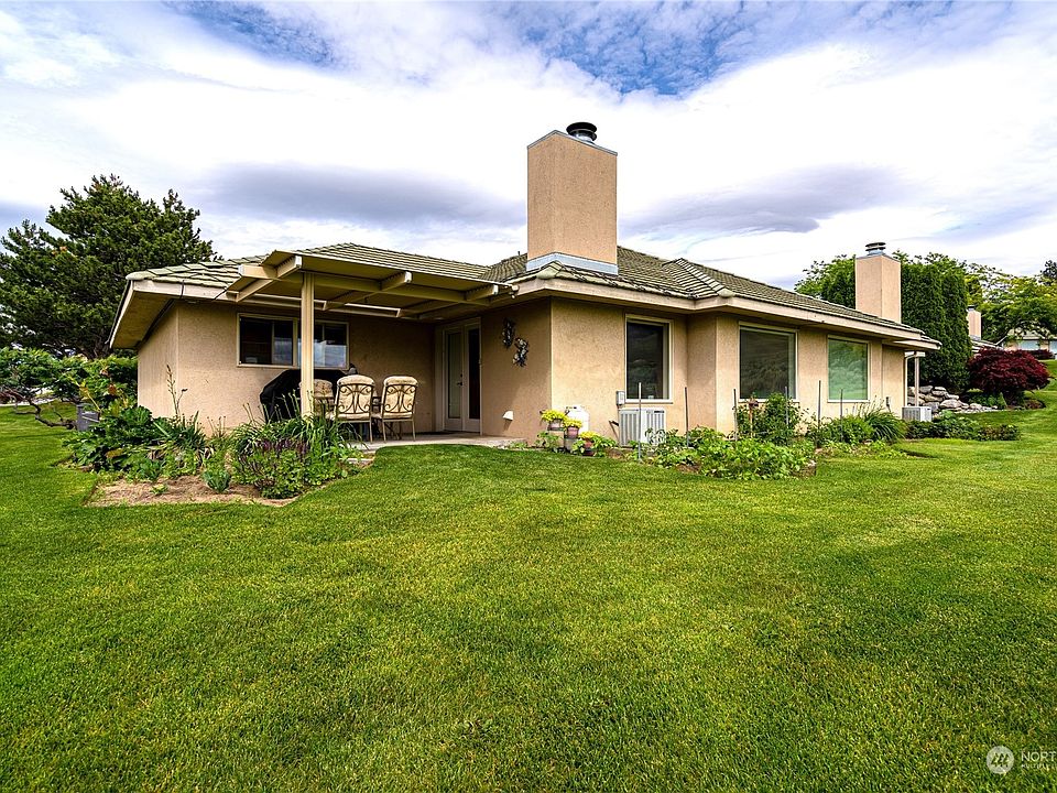 Rare find - Desert Canyon Villa CORNER Unit on the 9th Tee! Single-level living with an open-concept floor plan. Vaulted ceilings give this unit an extra spacious feel. The large primary bed and bath make you feel like you're living in luxury. HOA handles the yard, so you get to spend your time enjoying the golf course, pool, tennis court, Columbia River or food and drinks at the Oasis Bar and Grill. Sit on your back patio and enjoy beautiful views in every direction. It's your perfect spot for Summer or Winter. This home is in great condition, and ready for you to move in as-is or make it your own with cosmetic updates.