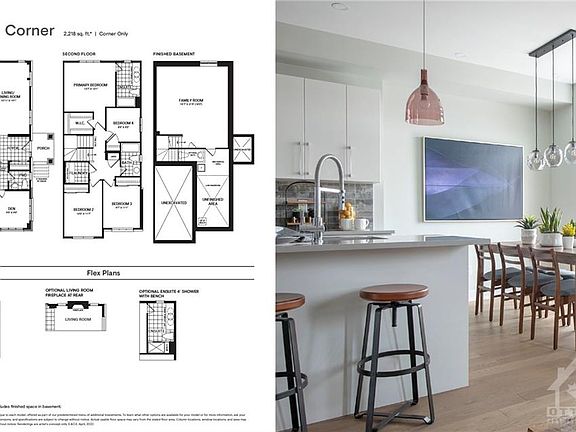 Barrhaven Quinn's Pointe, easy access to the retail and dining amenities along Strandherd Drive and Greenbank Road, and lots of school options for your children. The most sought after Minto biggest townhouse model, situated on corner, featured with 2,218 sq.ft of living space, 9 foot ceilings on main, smooth ceiling on main and second and basement, 4 beds, 4 baths, all bathrooms with upgraded quartz countertops, one gas fireplace in living room, hardwood throughout main and hall way on second, one finished bathroom in basement, massive finished family room in basement, Pot-Lights in Kitchen / Living/ Den/ PR, second floor laundry room,Smarter Home Hub, Smarter Home Thermostat, Water Leak Sensor, Smarter Home Performance Monitoring, six windows at side giving plenty of sunshine to bright family. 6 appliances included. The property under construction, showing model home possible through builder, site viewing need get builder approval in advance.