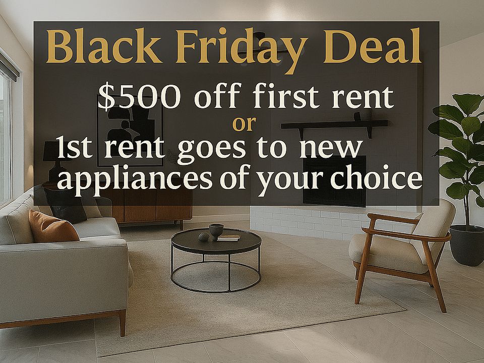 - Special offer! Get 500$ off first month, or first month rent used towards new appliances of your choice, valid to November 27.Expires November 27, 2025