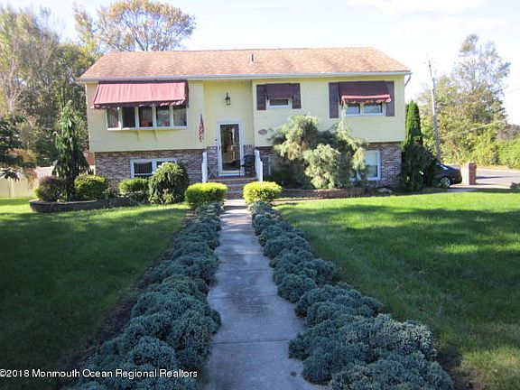 REDUCED TO SELL!!!! WINNER..... Bilevel with lots of Curb Appeal...... Corner Lot...Custom Landscaping....Driveway with pavers...Features Living Room with large bay window, Dining room with slider to trek deck, Eat in Kitchen Off white cabinets, Corian counters , Stainless appliances, 4 spacious bedrooms, 1.5 Baths, Huge Family room, great for entertaining with sliders to patio, laundry room, and direct entry to garage. Lots of great features, gleaming hardwood floors in Foyer, Living Room, Dining Room, Kitchen, paneled doors, newer furnace, plenty of closets and retractable awning on deck. . A must see....Close to Rt 66, Parkway, Rt 18, Shopping and Beaches