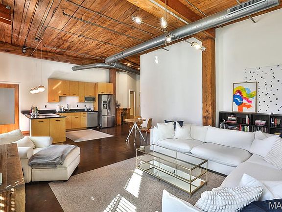 Experience stylish downtown living in this beautifully updated 2 Bed/2 Bath loft in the sought-after Moon Brothers Carriage Lofts! Offering approx. 1,240 sq ft, this unit features soaring wood beam ceilings, polished concrete floors, exposed brick, and 3 newer energy-efficient Andersen windows that fill the space with natural light while keeping things quiet inside. The open layout includes a sleek kitchen w/quartz countertops, breakfast bar, and stainless steel appliances. Both bathrooms feature granite vanities. Additional highlights include a newer washer & dryer w/5-year warranty, freshly painted interior, new chandelier, cleaned ductwork, and a dedicated storage unit with easy access. The assigned uncovered parking spot offers a convenient pull-through exit. Building amenities include a rooftop deck with stunning views of the City Museum, 2 dog areas, and professional management. Tucked away just off Washington Ave—peaceful yet steps from CityPark, Union Station, restaurants, nightlife & more!
