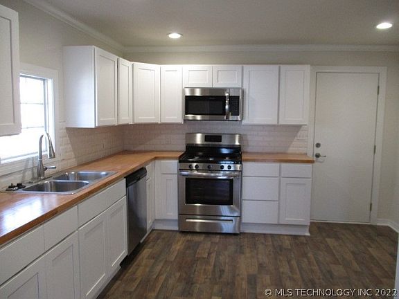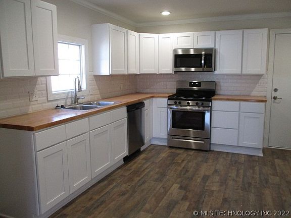 Remodeled down to studs. Everything is new, paint, cabinets, microwave, dishwasher, stove, flooring and so much more! Eat in Kitchen, butcher block counters, laminate wood flooring, fenced yard. In the heart of Sand Springs. Easy drive to Tulsa for commuters. Own this instead of renting!