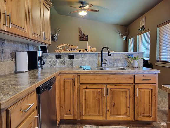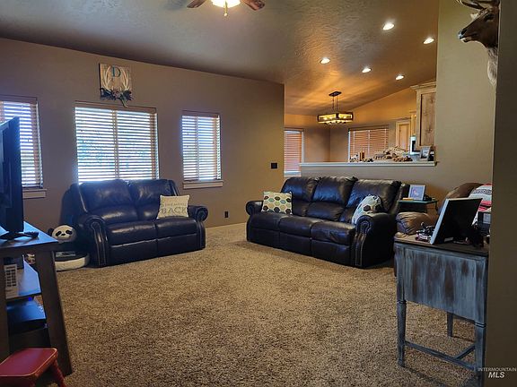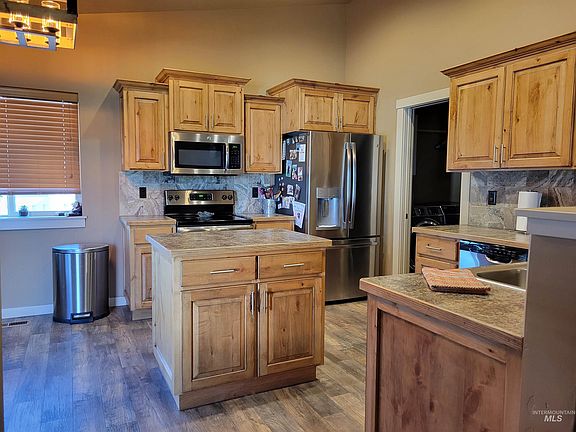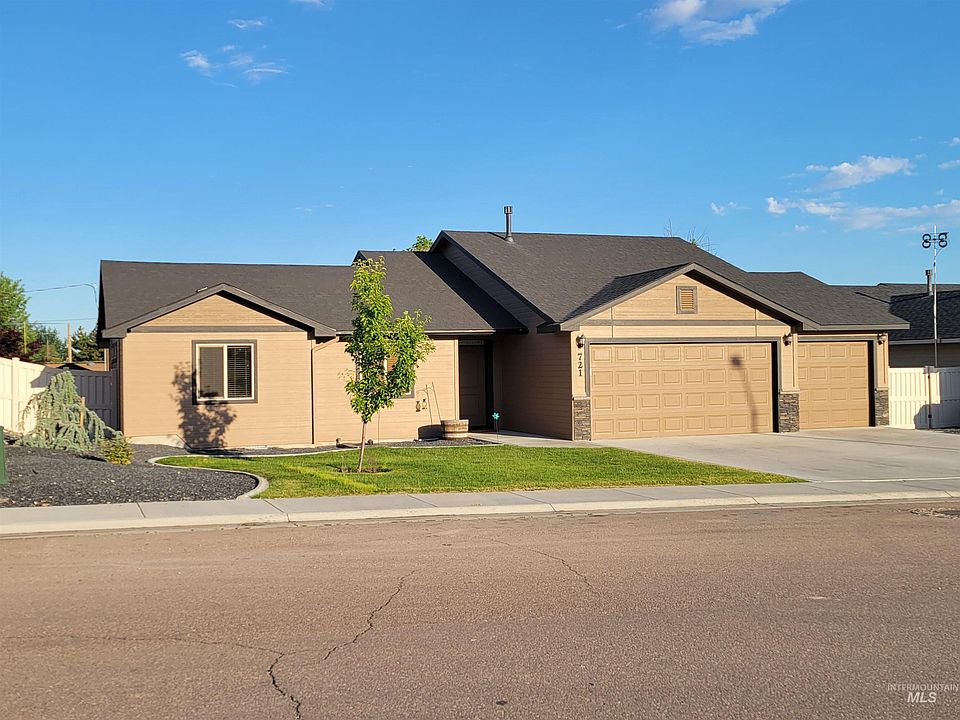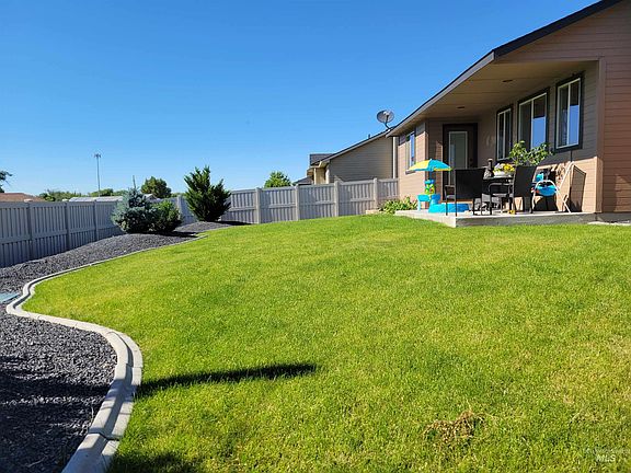Watch the sunsets from your back patio and enjoy a nice fully landscaped easy keeper back yard. Vinyl fencing is in place and this property is ready for the pets.  Great looking front yard landscaping with curbing and rock, full sprinklers and extra storage area beside the garage.  Well kept home.  Nice entry way that opens up to vaulted ceilings in the living room and a good sized kitchen with center island. The pantry in this home is amazing and is also combined with your laundry and mud room.  All the bedrooms are located at the same end of the home with this floor plan.  Master suite has good sized closet. The triple car garage is very spacious with door to exterior in the back to access the back yard and a bit of storage area. Both garage doors have openers for the ease of parking in the garage. Storage shed on South side of home with a cute path up to it offers room to store your yard equipment or smaller furniture.