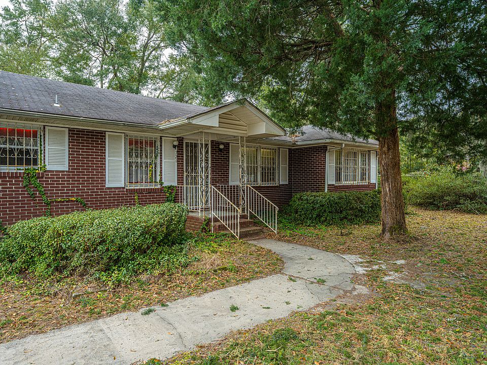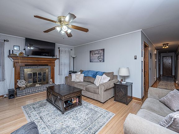 Welcome home to this lovely brick ranch situated on a very spacious 1 acre lot!!! Enjoy a cup of coffee in front sun room/enclosed porch. Entering through the front door you are greeted by wood floors that span throughout, except for tile floors in bathrooms. Cozy up on the couch in front of the wood burning fireplace located in the family room. Kitchen offers, lots of cabinets and counter space. and a penisula, affording an extra seating area. Enjoy cooking on the electric cooktop and baking in your wall oven, both newer. Primary Bedroom is big enough for a king sized bed. En-suite bathroom boasts a walk in shower. The 3 secondary bedrooms are good sized and coveniently located near the guest bathroom.. (2 of the bedrooms use the large closet spaces in the hallway) Fully fenced yard large enough to create your dream garden, oasis that already boasts beautiful mature tress. Plenty of space to park your cars and toys. 1 Car carport attached to the house. Park your boat, RV, etc.., under the 2nd detached Carport. Storage shed offers extra storage. Separate 827 sq.ft. building on the property, currently being used as a game/recreational space, allows for a multitude of commercial uses. Plumbing and Electric were updated, but does need some TLC. It has city water and sewer. While the home is on well and septic. There used to be another dwelling where the stand alone electric pole is located, and is a perfect space for a possible future build. Home and property are zoned Interstate/Interchange Commercial , this would make an ideal work/live property! A must see, schedule your viewing today.