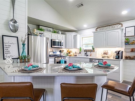 Gorgeous newly remodeled home with the farm house appeal. All new paint, appliances, epoxy kitchen counter tops with the marble look (non porous, heat proof, and can be cleaned just like glass),deep farm house sink, commercial grade porcelain tiles with a refurbished barn wood look. very large back yard in a well established neighborhood. Home is within walking distance from all the Prairie Grove Schools. This home has too many amenities to even mention. None of the curtains or hardware will convey with purchase.
