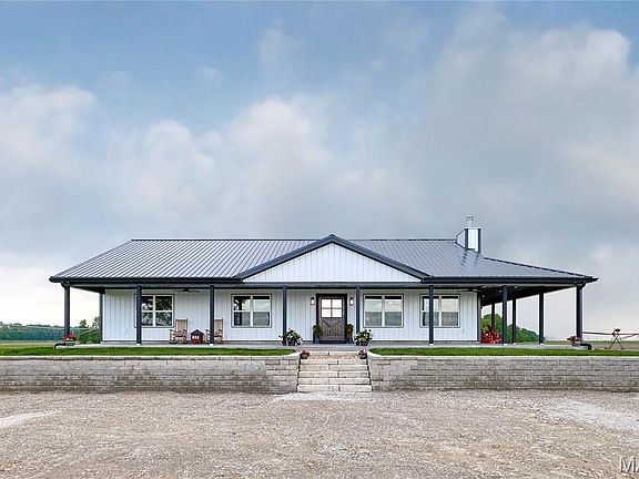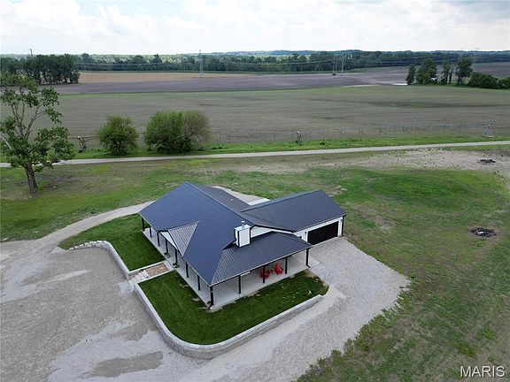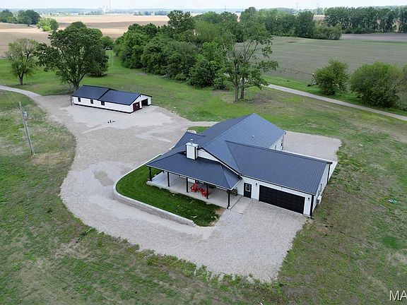 Welcome to this beautiful 2023 built, 3 bed, 2 bath ranch on 8 acres in St. Charles County! Soaring ceilings, open floor plan, oversized drive-through garage, huge workshop/shed & so much more! Walk up to the spacious wraparound porch w/ spectacular views. You’ll say Wow! when you enter into the open living room w/ energy efficient woodburning fireplace. Kitchen is a chef's dream w/ tons of custom cabinetry, SS appliances, large pantry, quartz/granite counters & live edge wood breakfast bar! Dining rm offers access to porch for morning coffee! Huge laundry right off the kitchen leads to insulated extra oversized pull-through garage w/ mini-split system. Primary suite boasts walk-in closet & full en-suite bath. 2 more bedrooms & full hall bath finish out the interior. Tons of exterior space on 8 acres includes huge workshop/shed w/ newer roof & garage doors. Unique property nestled in beautiful St. Charles country surrounded by farmland, backs to Katy Trail & in Orchard Farms Schools!