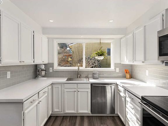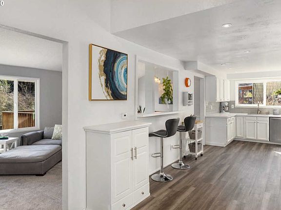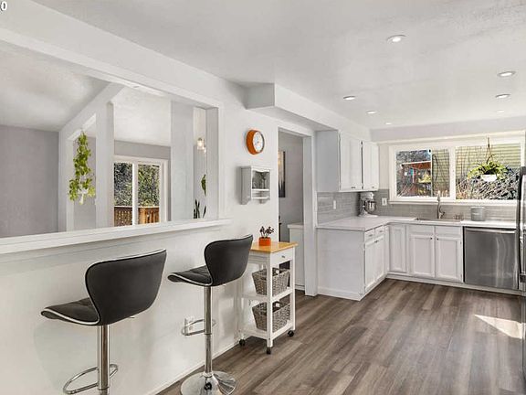 Modern updates really refresh this mid-century home that backs to greenspace. Vaulted ceilings & tall windows create an open, airy space with serene view of trees. Master suite features updated bath & slider to private deck. New flooring throughout & fresh paint. ADU potential lower level family room with fireplace, kitchenette, bed, full bath, & outside entry. Territorial views from the multiple decks with spacious fenced yard. Adorable front courtyard. [Home Energy Score = 2. HES Report at https://rpt.greenbuildingregistry.com/hes/OR10183080]