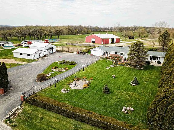 57 ACRES OF LAND WITH HUGE HOME, HORSE BARN W/STALLS, HAY BARN, INDOOR ARENA, AND SPRING FED POND WITH GAZEBO! A front gate leads you into this amazing property. The land could be hunting property. A road leads back to the spring fed pond complete with gazebo. The front horse barn has a gas line for a heater, a concrete floor in hall, built-in drainage, washroom, & hay room. Barns are on their own electric meter. There is also a large indoor arena w/own well. NO SHORTAGE OF SPACE & PLENTY OF LARGE ROOMS & ENTERTAINING SPACE IN THE HOME THAT HAS HAD A COUPLE OF ADDITIONS! The home boasts a KIT open to a LR w/French doors that lead to a sunroom on one side, & a game room w/cathedral ceilings & skylights on other side. There is an exercise room w/skylights & French doors that lead to a deck & patio. There is also a huge family room w/fireplace connected to a rec room w/cathedral ceiling & skylights. HUGE MBR has shared full BA & WIC. 2 furnaces/AC & generator all newer. Zoned AG.