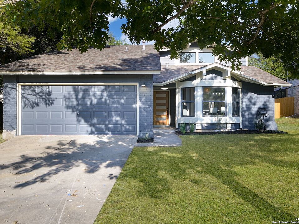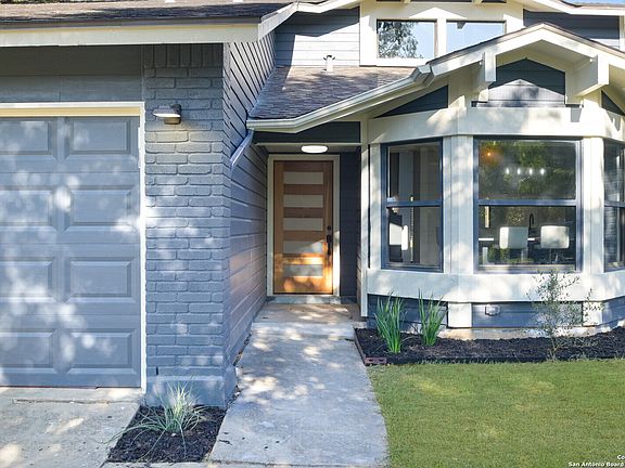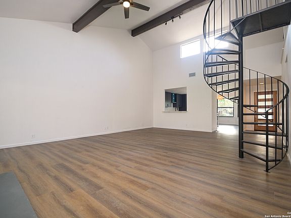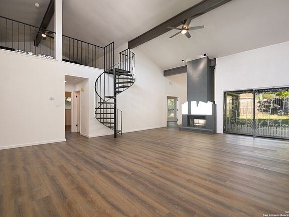 Beautiful 3-bedroom, 2-bath modern home with an inviting open floor plan and soaring 20-foot ceilings adorned with striking wood beams. A stunning two-sided fireplace serves as a cozy focal point, enhancing both the living room and adjoining space. Expansive windows fill the area with natural light, creating a bright and airy ambiance. The fully renovated eat-in kitchen is a chef's dream, featuring stylish cobalt blue, slow-close cabinets with brass pulls, sleek quartz countertops, a subway tile backsplash, and a spacious island that's perfect for both meal prep and family gatherings. The primary bedroom is a serene retreat with a vaulted ceiling, adding to its spacious feel. The en suite bathroom has been transformed into a spa-like oasis, featuring new herringbone mosaic tile flooring, a modern walk-in shower, and a double vanity with quartz countertops. A skylight brings in beautiful natural light, enhancing the tranquil atmosphere.Upstairs, you'll find a versatile bonus room ideal for play, relaxation, or entertainment, complemented by freshly painted built-in cabinets and updated flooring. With its tasteful upgrades, thoughtfully designed spaces, and beautiful finishes, this home offers an ideal blend of style, comfort, and functionality in the heart of Northeast San Antonio.