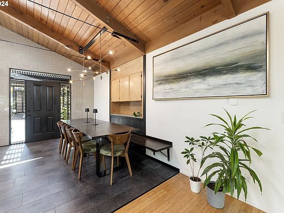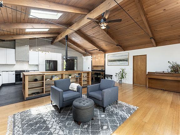 Gorgeous mid-century on oversized lot on a culdesac in the desirable Mt. Scott - lots of privacy inside and out. The spacious main floor features vaulted wood ceilings with skylights giving the space amazing natural light. An open layout adds to the spaciousness. The chef's kitchen is spectacular with custom Italian tile walls, Quartzite counters, stainless steel appliances, and large island. The living room has a gas fireplace and slider to deck - perfect for entertaining. The dining room has a hutch for storage and a built-in bench. The primary suite features a walk-in closet with built-in storage. All new carpets. Downstairs, you find a large family room with a full kitchenette, a second bathroom and two bedrooms. The covered patio is perfect for rainy days. The oversized yard is fully fenced and there is a garden/tool shed for additional storage + raised beds and fruit trees. Lots of parking in the driveway - room for all your toys! New HVAC. [Home Energy Score = 3. HES Report at https://rpt.greenbuildingregistry.com/hes/OR10133666]