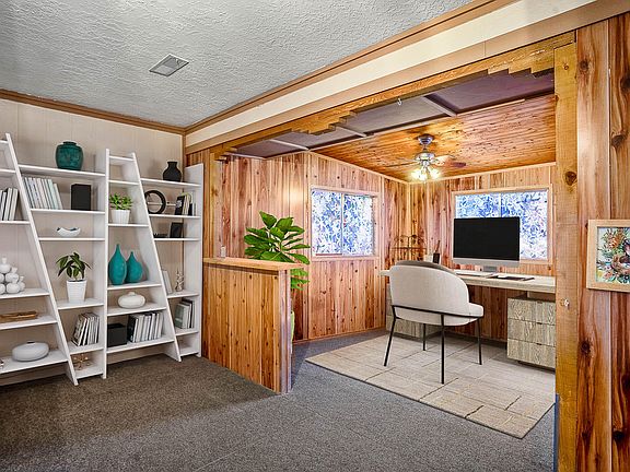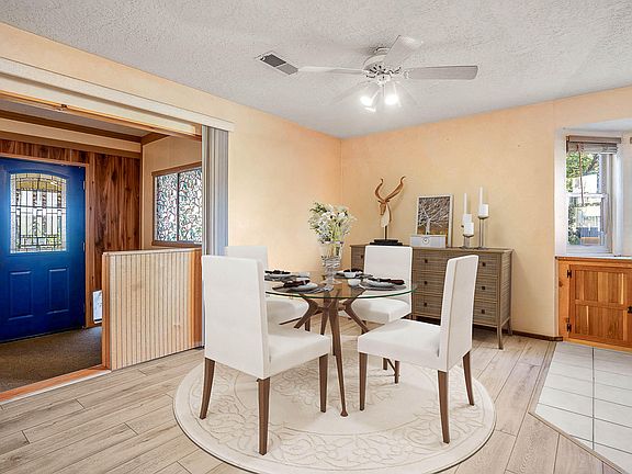 Welcome to this charming Rio Rancho home on a spacious .205-acre lot! This 3-bed, 2-bath gem features a bright living room with a wood-burning stove, a kitchen with sunny breakfast nook, and a separate dining room with built-in shelving. A versatile flex room off the kitchen offers endless potential--office, game room, or private spa retreat. The current owner enjoyed it as a hot tub room, and it opens directly to the covered back patio. Step outside to a beautifully landscaped backyard with a covered patio, pergola-covered spa pool (conveyed as-is), Sandia Mountain views, raised garden beds, a pond/water feature (also conveyed as-is), garden shed, and workshop. Enjoy a 2-car garage, laundry room, extra storage throughout the entire home and the peace and privacy of a well-loved property.
