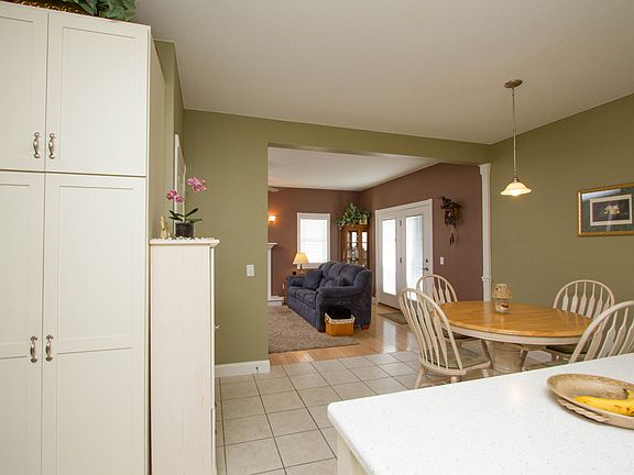 Finished basement adds over 500 square feet of comfortable living space. High ceilings! Wired for surround sound w/insulated walls, glass block & wet bar. Wet bar comes with beer tap and wine refrigerators. Laundry on 2nd floor. Lots of natural light. Tilt-out windows. Kitchen has roll out pantry, double ovens & Corian counters. Composite deck & stamped concrete patio. Approx 3 acres of private green space included for kite-flying & doing cartwheels! Nestled on a low-traffic cul-de-sac. Alarm system with motion sensors, temperature, and sump pump alarms. Warranty included!