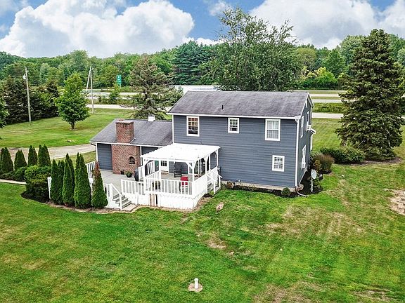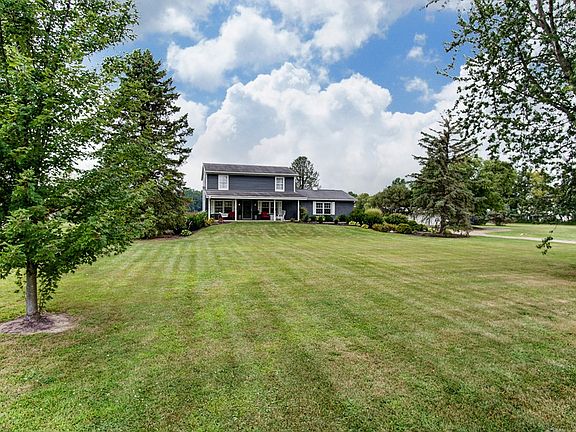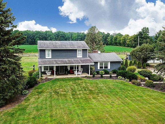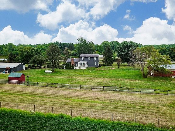 Loads of opportunities! This wonderful home hosts 5 bedrooms 2 full baths, first floor laundry and owners suite. A large covered porch welcomes you. Step in to the formal dining room that leads to the kitchen and large great room. The great room offers vaulted ceilings, exposed beams, large bay window, and a propane fireplace. The eat-in kitchen has white cabinets, stainless steel appliances. Enjoy the panoramic view of the property from the back deck. The home is sitting on 4.45 acres of land and has a 3 car detached garage that has an expansive lean-to for extra storage. 3 stall barn with livestock shelters and pastures, and a building that could be easily converted to a home office. This home is ready for you to make it your own. Agents see Private for more details.