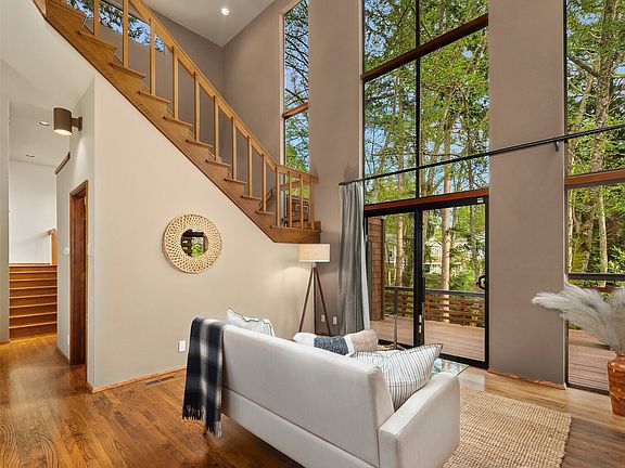 Perched in Edmonds’ coveted Cherry Hill, this 3-bed home blends warm cedar siding w/ sleek metal & glass, blurring the line between architecture & landscape. Great room stuns w/ soaring 20+ ft ceilings & sky-reaching walls of windows, feel immersed in nature & luxury. Chef’s kitchen w/ Carrera marble countertops, built-in pantry shelving, 4-burner gas cooktop, griddle, & pot filler. Spacious formal living w/ gas fireplace & French doors opening to expansive entertaining deck. Top-floor Primary Suite feels like private treehouse. Spa-like 5-piece Carrera bath & dual WICs. Den opens to rooftop deck. Lower-level wine cellar. Miele W&D, hardwoods throughout, 2-car garage, driveway & st parking. Upper-level firepit. Mins to Bowl, dining & beach.