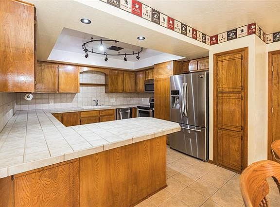 with breakfast bar, lots of cabinets, new burnish slate metal roof, stylish privacy fence, circular driveway, spacious backyard and
