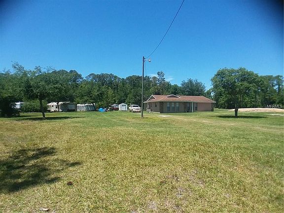 BACK ON THE MARKET!! BUYER'S FINANCING FELL THROUGH.....Peaceful, quiet country living, just 20 minutes from major shopping locations!!! Or grab a gallon of milk from the country store down the road!! 5 acres with over 4 acres high and dry, this solid home comes with 3 storage sheds (and a pump house) and a little pond out back that is home to a family of otters during certain times of the year. Plenty of wildlife to gaze upon while sipping coffee in the screened lanai, including deer and turkey. This 3 bed/ 2 bath has a split bedroom plan, with a very large dining room as you enter, and a kitchen with breakfast bar overlooking the living room. The enclosed 20x22 garage is ready for A/C ductwork, or can be used as a workshop. Brand new septic and drain-field!! There is an RV hookup on the property as well.This low price reflects the floors and painting needed indoors. All measurements are approximate. Excepting all offers until 5pm May 7.