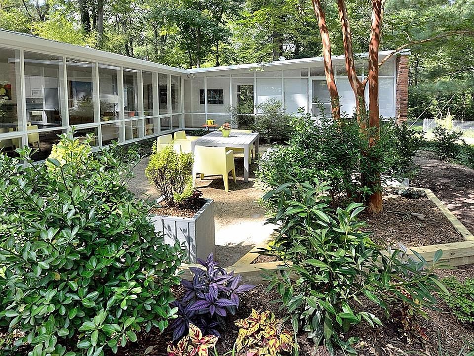 Completely remodeled mid-century modern home with TWO Goodman additions, studio and foyer plus butterfly roof master suite. Renovations include remodeled kitchen, master bedroom suite, plumbing, electrical, HVAC, tankless hot water heater, ceilings, recessed lighting, plus so much more. Gorgeous corner lot with wonderful outdoor space includes courtyard and screened in porch.