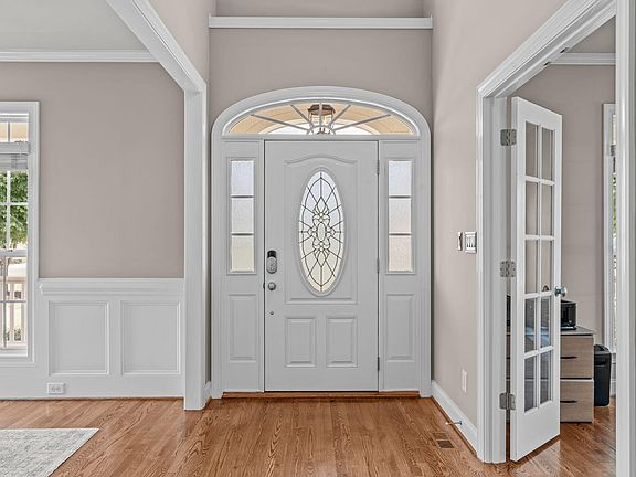 Positioned on one of the most picturesque lots in a sought-after pool community, this custom-built two-story traditional home blends timeless southern charm with thoughtful functionality. A spacious covered front porch offers a warm welcome and a perfect spot to greet guests or unwind outdoors. Inside, you're greeted by a double-height foyer that sets the tone for the home's elevated craftsmanship. Site-finished hardwoods extend throughout the main living areas, including a formal dining room ideal for gatherings and entertaining. The kitchen is a standout, featuring granite countertops, a large island with bar and counter-height seating, an eat-in breakfast area, and a butler's pantry. Staggered-height, soft-close cabinetry adds both dimension and convenience. The living room is anchored by a cozy gas log fireplace and custom built-in bookshelves. A main-level office with an adjacent full bath offers flexible use as a guest suite or private workspace. Upstairs, you'll find three bedrooms and an oversized bonus room, ideal for a playroom, media lounge, or home office. The primary suite features enhanced ceiling height, a soaking tub, separate shower, water closet, and dual vanities. Additional features include an oversized garage and side service door, an extra-wide driveway for ample guest and multi-vehicle parking, and a functional drop zone located in the laundry room just off the garage entry, which also includes a utility sink. Tile flooring is found in all wet areas. Step out back to enjoy serene pond views from the expansive screened porch and adjoining deck, both east-facing to provide shaded comfort and gentle natural light throughout the day. All of this comes with no city taxes and convenient access to downtown Fuquay-Varina, I-540, shopping, dining, and more. This home is truly the perfect blend of location, layout, and lifestyle, situated on a rare waterfront lot that is hard to replicate in today's market.