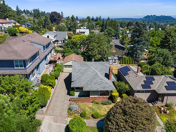 Rare opportunity to live just steps from Mt Tabor Park on a quiet hillside street. Charming bungalow-style, one-level home with multiple options for bedrooms and living spaces. Large living/dining room with wood fireplace allows for open-living-space options. Main floor kitchen with eating space open to family/sitting area that could be converted back to second bedroom. Large, windowed door leads out to spacious covered porch overlooking a mature yard and garden. The finished lower level with wood fireplace could be used as a cozy master bedroom or family room. Kitchen space on the lower level provides opportunities for separate living quarters. Modifications to lower-level outdoor entrance provides further possibilities. Detached, oversized garage provides both parking and storage.