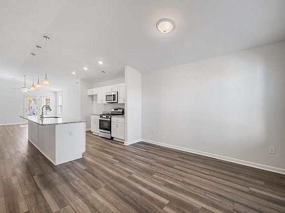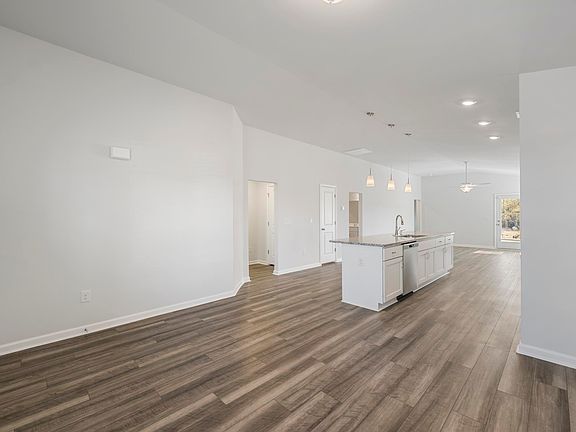 As soon as you step inside you will love the vaulted ceiling that spans from the flex space all the way through the kitchen and great room. Enjoy stainless steel gas appliances, and pendant lights over the HUGE kitchen island. White cabinets throughout the home and beautiful granite countertops in the kitchen. Luxury vinyl plank flooring throughout the main living areas. The primary bedroom is located in the back of the home and features a walk in closet, double vanity, five-foot walk-in shower, and linen closet. The two secondary bathrooms have walk in closets as well and are separated by a full bathroom. Enjoy the outdoors from your patio & covered porch which is located just off of the great room.