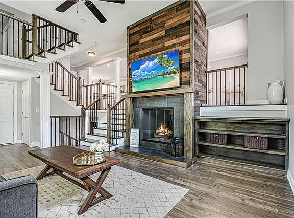 Don't miss this stunning home! This California split home offers so much space with 3 bedrooms and 2 1/2 updated bathrooms and two living areas.There is an open staircase that looks all the way to the upper floors and is unique in every way. The kitchen is the perfect chef kitchen with custom cabinets, amazing counter tops, stainless appliances and views into the back yard that will take your breath away. The tall ceilings help showcase the floor to ceiling fireplace in the living room and one in the dining room.