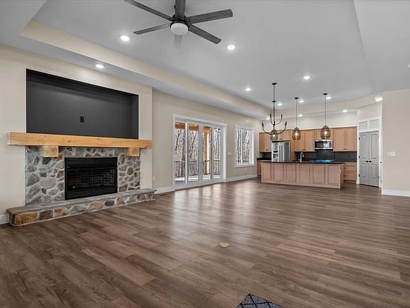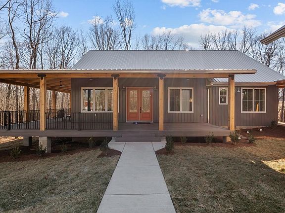 Peaceful, tranquil retreat offering ultimate privacy. Wrap around porch ideal for indoor/outdoor entertainment. Open floor plan designed by professional architect with every detail in mind. The total square footage under roof is 4072. 10 foot ceilings throughout with 11 foot stepped ceiling in kitchen/dining room and primary bedroom. The kitchen has a 5x5ft walk in pantry & 5ft butler pantry with a 9.5ft island with 6 bar stool capacity and chiseled edge granite. Kitchen also offers induction cooking stovetop. Dining room with 10ft sliding door to side porch. Low E double pane vinyl windows throughout home. Great room with built in ventless gas fireplace with stone surround. Front entry double door 8 ft tall with rain glass. Maintenance free exterior and TREX decking. Cypress and cedar porch breezeway including exterior porch with 8 inch solid cedar posting. Covered breezeway connects garage to side entry. Luxury vinyl flooring throughout. Metal siding on all exterior. whole house utilizing sate of the art spray foam insulation. Spray foam insulated metal roof including foam insulated crawl space offering maximum efficiency. Includes HE heat pump with electrostatic filtration system and LED exterior lighting throughout. 1Gig Fiber Internet available at location. Easy 20 minute commute to Dickson, 35 minutes to Clarksville and 45 minutes to Nashville.