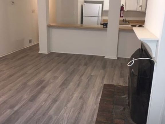 Shared yardWood-look laminate floorsHuge kitchen with dishwasher