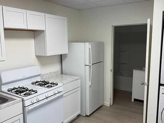 The updated kitchen includes a refrigerator, gas stove, and oven, while the in-unit washer and dryer offer added convenience. The bathroom features a new vanity and full shower/tub combo. The bedroom provides a closet for storage and a ceiling fan for comfort.