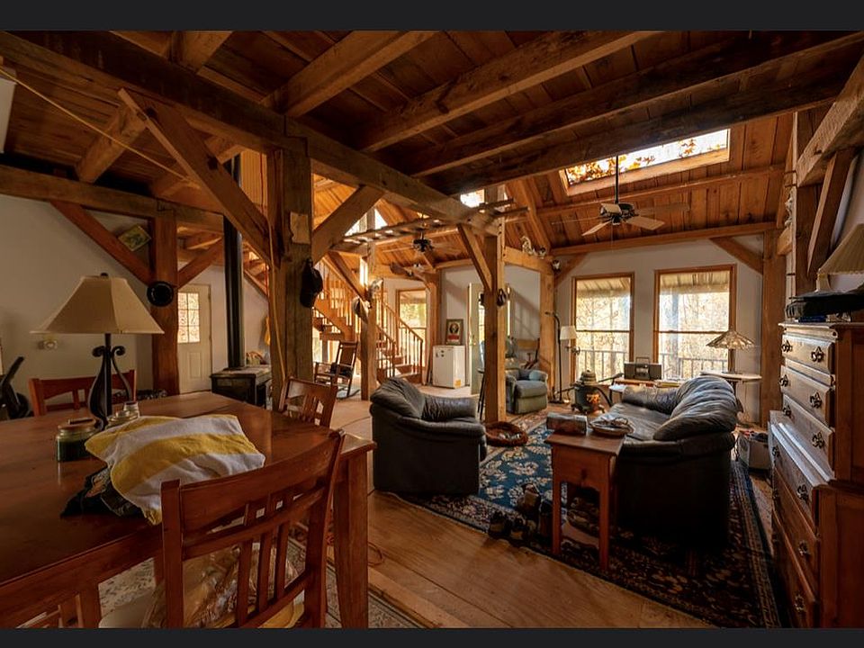 This craftsman style, handy man special definitely has potential. Private, unrestricted 5 acres. Sturdy, wood beams, the soap stone fire place will keep you warm in the winter months with oil, wood or coal. Everything you see stays. Septic/Well. Could possibly be lived in while you flipped this cozy home.