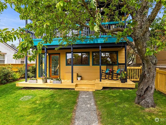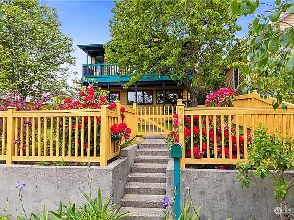 Phinney Ridge one-of-a-kind! Well-maintained 3bd/2ba with a contemporary attitude. South-facing, front porch, big fenced yard w/ magnificent cherry tree. Dramatic staircase introduces a reverse floor plan that truly lives large! 2 bdrms on entry level incl huge primary + 1 bdrm up = privacy. Upstairs, light-filled open concept, vaulted ceiling, french doors to spacious covered deck. Big, bright kitchen w/ tons of cabinets, connected to casual DR or home office. Off-alley, attached 2-car garage w/ loads of space for projects. Thoughtful interior storage + exterior garden sheds. Top schools, close to Green Lake & Woodland Park Zoo. Tree-lined blvds & sidewalks . Easy commute by car or transit. Pre-inspected, pristine, and move-in ready.