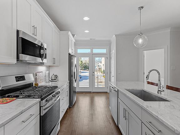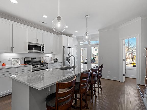 You'll love the views from this Oakwood Townes townhome: out the front straight down a street, and out the back at trees and nature. You'll also love that inside the home is finished with tasteful and timeless finishes, fixtures, and upgrades: enjoy 3 bedrooms (each with a full bath ensuite), functional separation of spaces, plenty of natural light, and 9' ceilings on every floor. And the heart of the home, the open-plan second floor, boasting a gas fireplace with tile surround and stained wood mantel in the living room, and Carrara marble counters, white cabinets (with under-cabinet lighting), stainless appliances, and a large island in the kitchen to enjoy it all every day. All in a central location mere blocks to parks, restaurants, coffee shops, and bars. Plus parking in the 1.5 car garage (and storage!), driveway, and with additional parking on the street. All with low HOA fees as well.