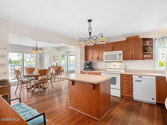 Million dollar sunsets within an easy commute of Albany or Schenectady at this year round 3 bed, 2 bath lakefront home on Mariaville Lake. Whether you love the thrill of a motorboat or the serenity of paddling your kayak, you'll love these welcoming, private shores. Enjoy one level living and a wall of windows that floods your open plan space w/ natural light. Every window offers a water view & the elevated deck has the best view of all. Whip up delicious meals in the tidy kitchen w/island. Savor lazy mornings with a coffee on your private deck off the primary suite w/ walk in shower. Luxe radiant floors. Gas fireplace. Generator. Boiler 1.5yrs. Roof 11yrs. Huge 2 car garage, sheds, docks & boat racks. Lot extends across the street.