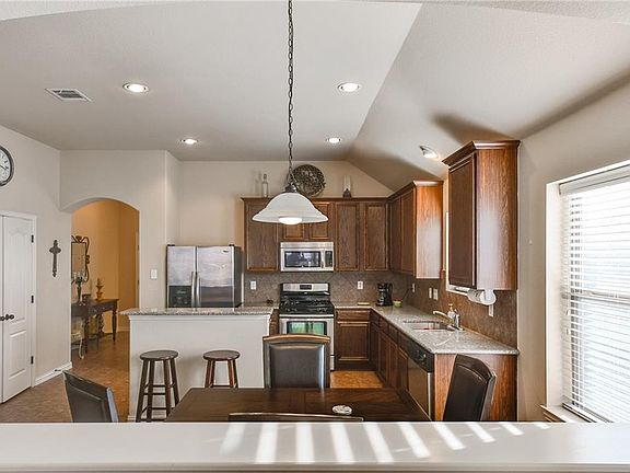 Beautiful Gehan home in highly desired La Frontera subdivision. Great open concept living, dining, and kitchen, with separate formal dining area. Island kitchen with stainless appliances and 42 inch wood cabinets, granite countertops & tile backsplash. Lovely wood burning stone fireplace. Split bedrooms provide privacy to the master suite. Master bath has walk-in closet, dual sinks, garden tub & separate shower. Soaring ten-foot ceilings throughout. Rounded corner construction on room entrances. Two inch blinds, sprinkler system. Plenty of room in the backyard for kids, pets, & entertaining. You and your kids will enjoy the community playground and swimming pool. Highly desired Mansfield ISD.