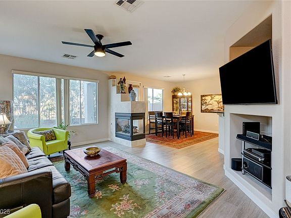 Beautifully maintained 3 bedroom + den/loft townhome in a gated Henderson community with pools and parks. This light and inviting floor plan features luxury vinyl plank flooring, a 3-way fireplace, and an open living/dining area that flows into the kitchen with quartz countertops and ample cabinetry. The spacious primary suite includes a private balcony with stunning views, walk-in closet, and ensuite bath. Enjoy a cozy backyard with a covered patio, perfect for relaxing outdoors. Water softener and reverse osmosis system included. Attached 2-car garage and a prime location near shopping, dining, parks, and freeway access. This home lives like a single-family but with the ease of townhome living. A must-see!