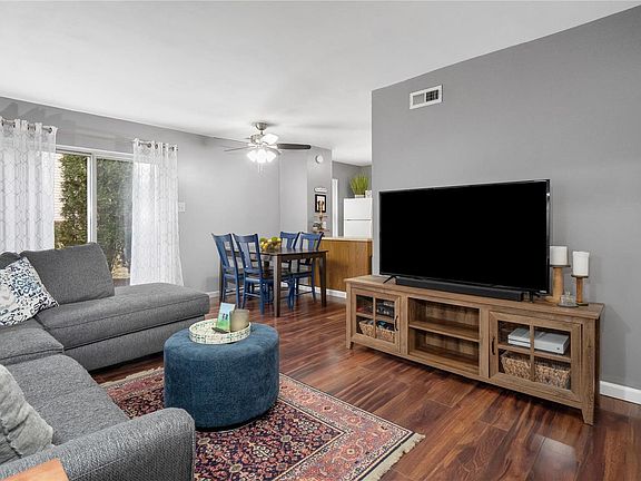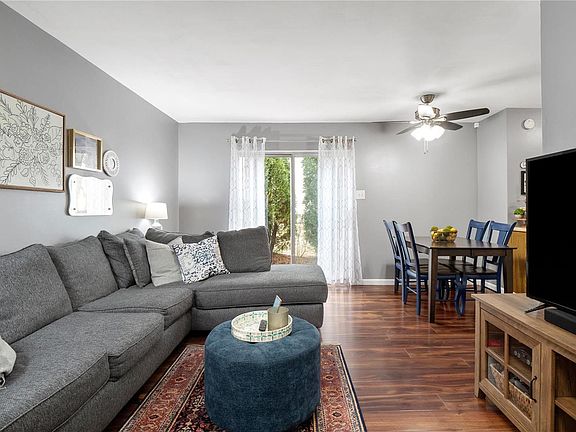 End Unit Townhome with Garage! 2 story entry offers spacious feel to an already open floor plan. Living and dining area offer high quality laminate flooring and generous living space that opens to kitchen. Kitchen is clean and crisp with ceramic floors, updated backsplash, new sink & island opens to dining room. Full-size main floor laundry along with 1/2 bath. New carpet, 2022, on stairs and upper level. Master bedroom comfortably holds king size bedroom set, has triple closet doors & modern lighted ceiling fan. Spacious upper level bathroom is updated, offers oversized vanity and has unbelievable natural lighting. Rear patio is surrounded by mature evergreen trees offering privacy all year long. Parking is a breeze in this townhome with 1 car garage and private driveway.